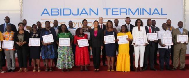 La filiale de Bolloré Transports, Abidjan Terminal, a honoré près de 200 collaborateurs, le 5 novembre 2021, pour leur fidélité et leur contribution remarquable au développement de l’entreprise et de la Côte d’Ivoire. Ce sont précisément 195 travailleurs qui ont reçu des médailles pour leurs bons et loyaux services à Abidjan Terminal, en présence du directeur de cabinet Tapé Aubin, représentant le ministre de l’Emploi et de la Protection sociale, et des membres de leurs familles. Les récipiendaires ont reçu onze (11) médailles « Grand or », seize (16) médailles « Petit or », cent seize (116) médailles « Vermeil » et cinquante-deux (52) médailles « Argent. »A travers cette célébration, Abidjan Terminal manifeste sa reconnaissance à ses collaborateurs qui ont fortement contribué à son développement, à ses performances actuelles, par leur professionnalisme, leur dévouement au travail et leur loyauté.« Notre entreprise, Abidjan Terminal, a pu réussir sa contribution au développement économique de la Côte d’Ivoire et de son hinterland, en restant attaché à ses valeurs. C’est donc en toute humilité que nous reconnaissons le mérite de ses collaborateurs, véritables artisans de notre succès », a déclaré la directrice général d’Abidjan Terminal, Asta-Rosa Cissé. La présidente du conseil d’administration, Martine Coffie Studer, confirme que le groupe qui emploie plus de 8000 personnes contribue énormément au développement de la Côte d’Ivoire et est déterminée à poursuivre sur cette lancée.Pour sa part, le directeur de cabinet du ministre de l’Emploi et de la Protection sociale, Tapé Aubin, a salué cette importante contribution et traduit soutien et encouragement de l’Etat pour les performances réalisées. Il a traduit ses félicitations à l’ensemble du personnel, particulièrement les récipiendaires.Grâce à sa politique de formation continue de ses équipes, Abidjan Terminal contribue au développement des compétences de ses collaborateurs. Fleuron de l’économie ivoirienne, l’entreprise reste également engagée dans leurs actions et initiatives en faveur du bien-être de ses collaborateurs.////////////////// Emmanuel Akani