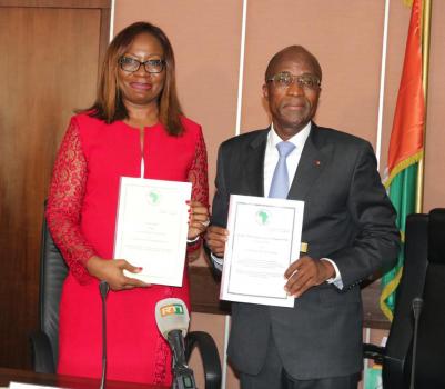 / Le ministre de l’Economie et des Finances, Adama Koné, et la directrice générale pour l’Afrique de l’Ouest du groupe de la Banque Africaine de Développement (BAD), Marie-Laure Akin-Olugbadé